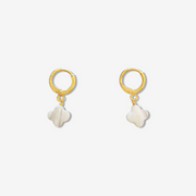 Classic huggie hoops with white mother of pearl clover-shaped pendant.