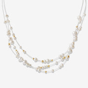- Freshwater pearls and small gold/silver beads threaded through with clear string in random order.